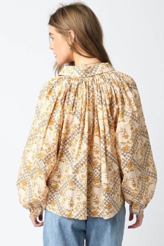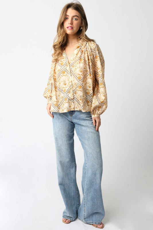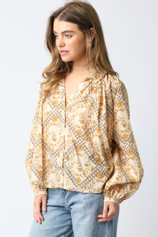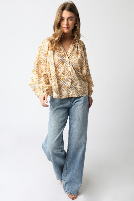 Elevate your style with this mix print, button down blouse, with a relaxed fit.