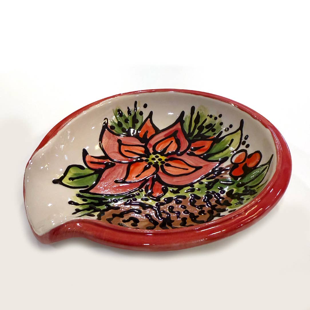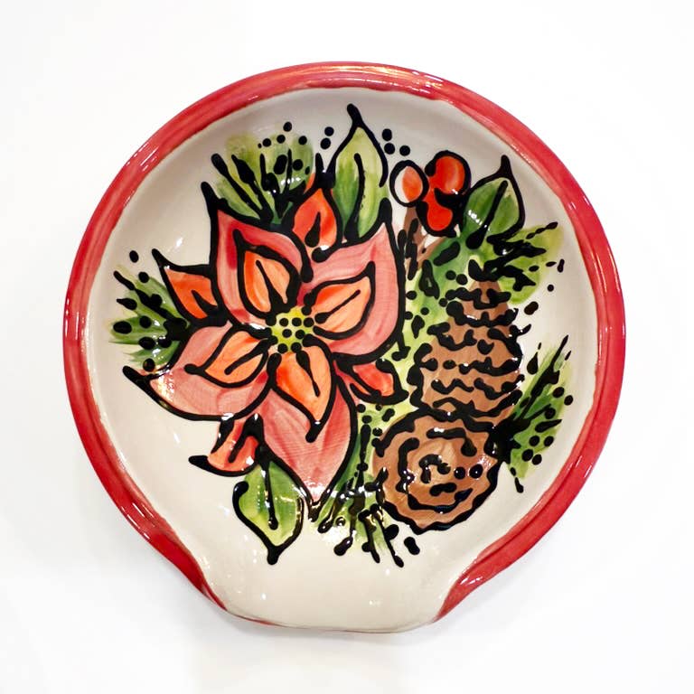 Celebrate Christmas with this hand painted ceramic spoon rest. This Magnolia Creative Co. original pattern features poinsettias, pinecones and classic greenery to brighten up your holiday table. Durable and easy to clean, it’s both fun and functional for everyday use. Size: 5¾" L x 5½" W x 1¼" H • Due to the hand painted nature of Magnolia Creative Co. piece, each one can vary slightly in pattern reproduction. OUR PRODUCTION PROCESS Our pottery is made of a low-fire earthenware and then hand glazed and fired in our Louisiana studio. Pieces with gold edge and/or gold details are added with a real 22k gold luster in a second firing. Each firing can last between 4 - 8 hours and has to cool for up to 12 hours.