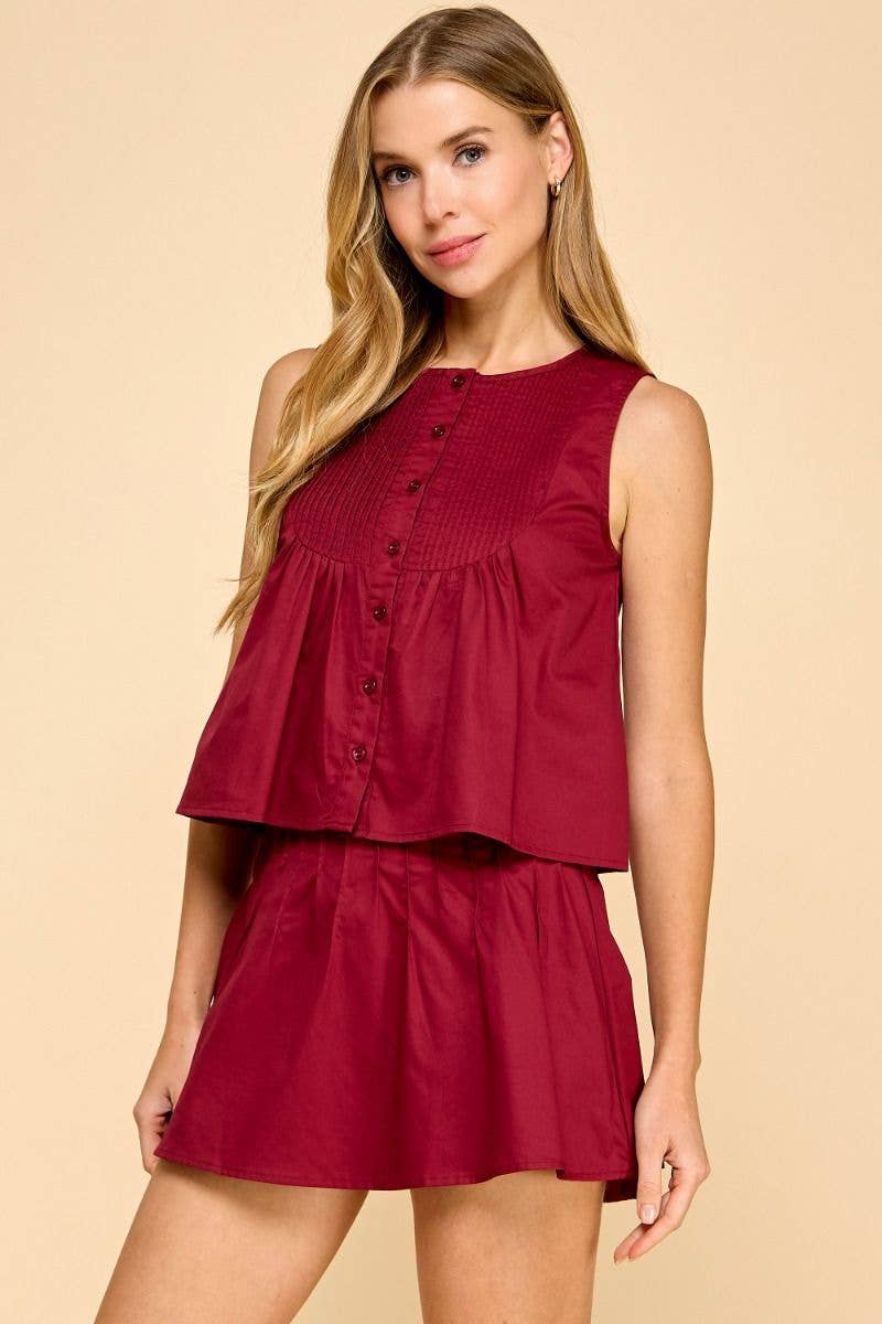 Button down sleeveless top featuring pleated chest detailing and a flowy hem.