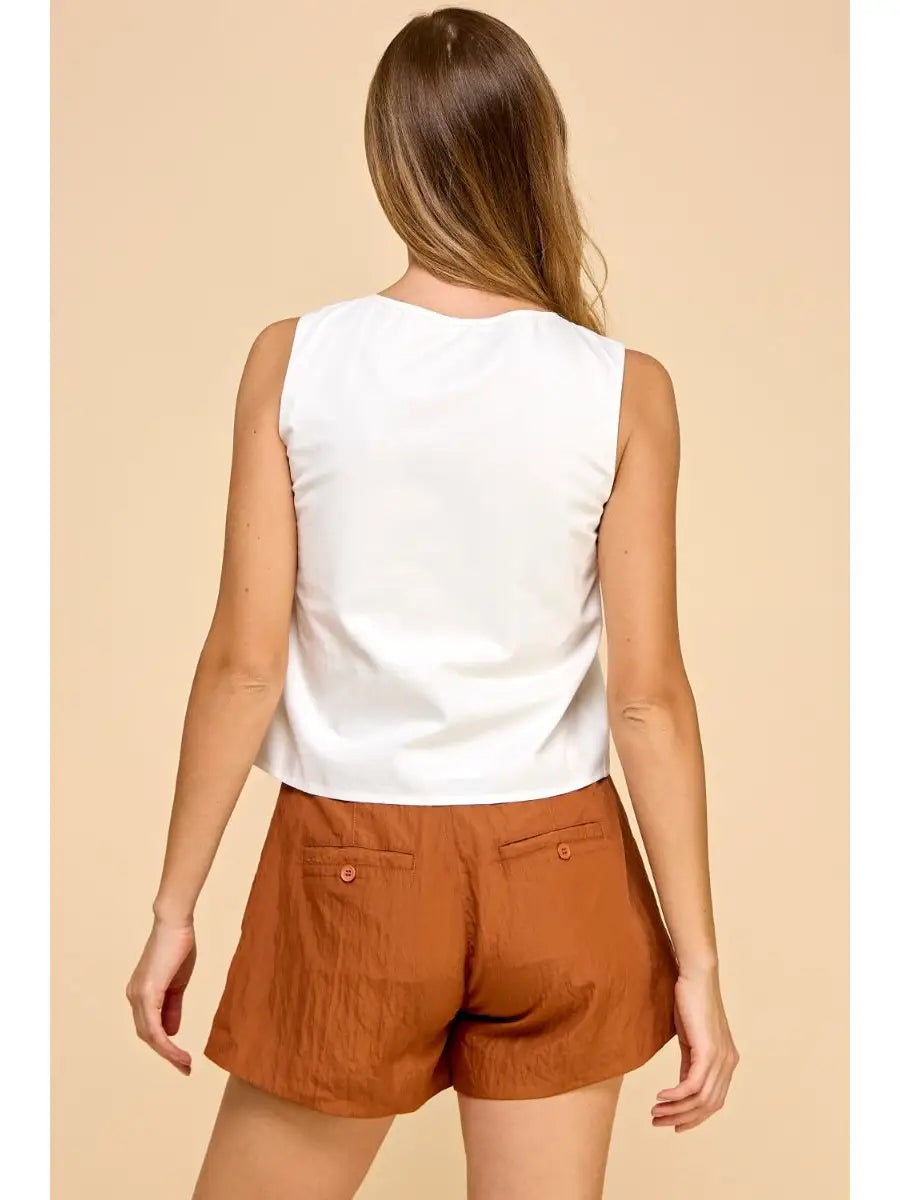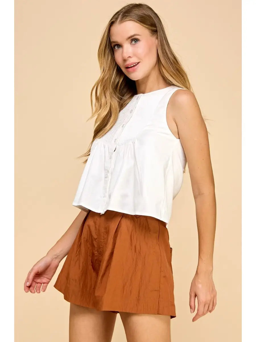 Button down sleeveless top featuring pleated chest detailing and a flowy hem.