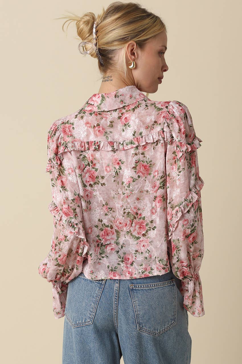 Our Dana Floral Ruffled Shirt features a soft ruffle detailing along the shoulders and front for a romantic touch and a relaxed button-down silhouette with long puff sleeves and cuffed wrists. Woven