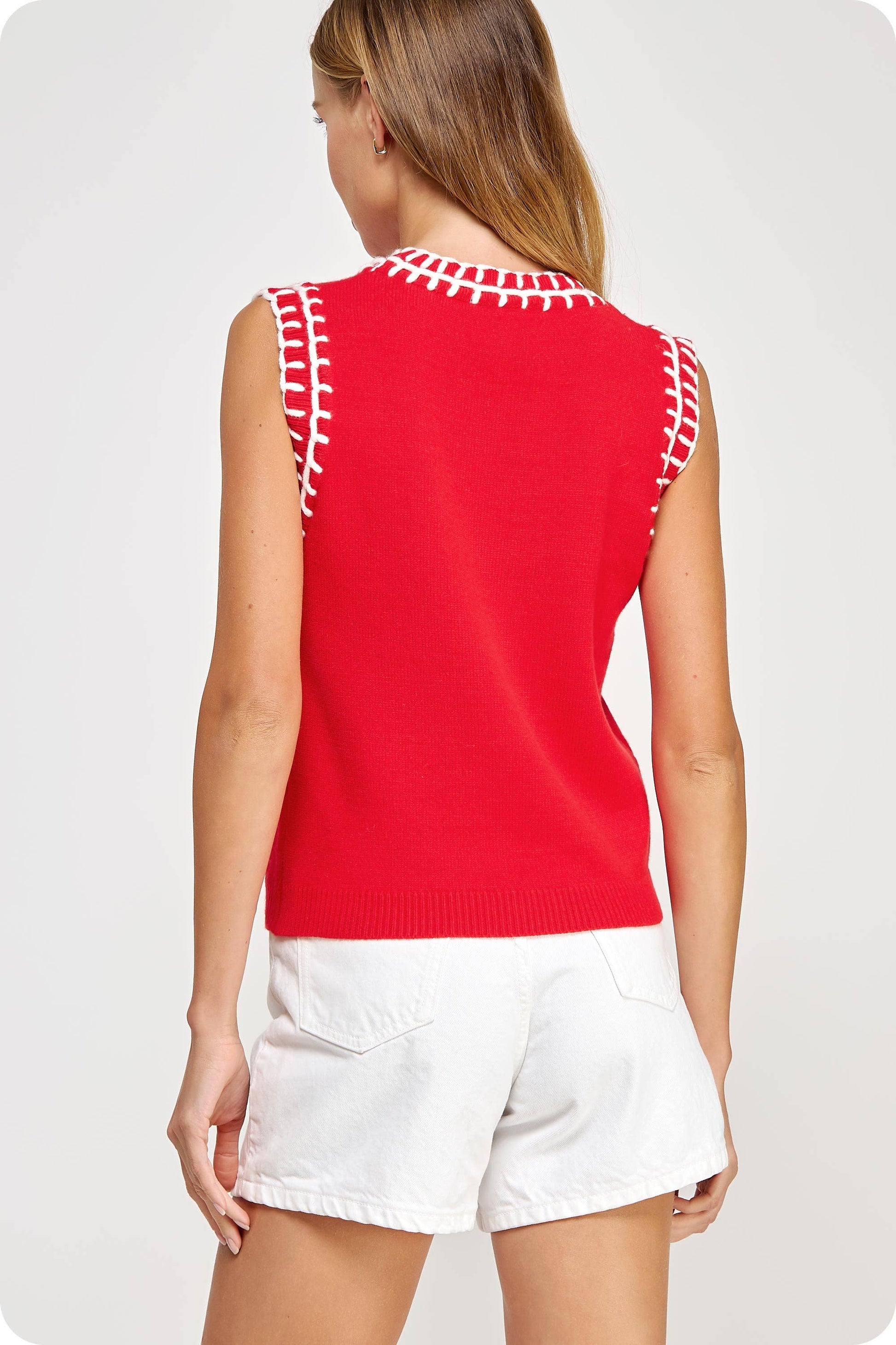 Embroidered sleeveless tank top in knit fabric. This versatile sleeveless style features ribbed hem, a round neck, and embroidery work throughout neckline/shoulders.