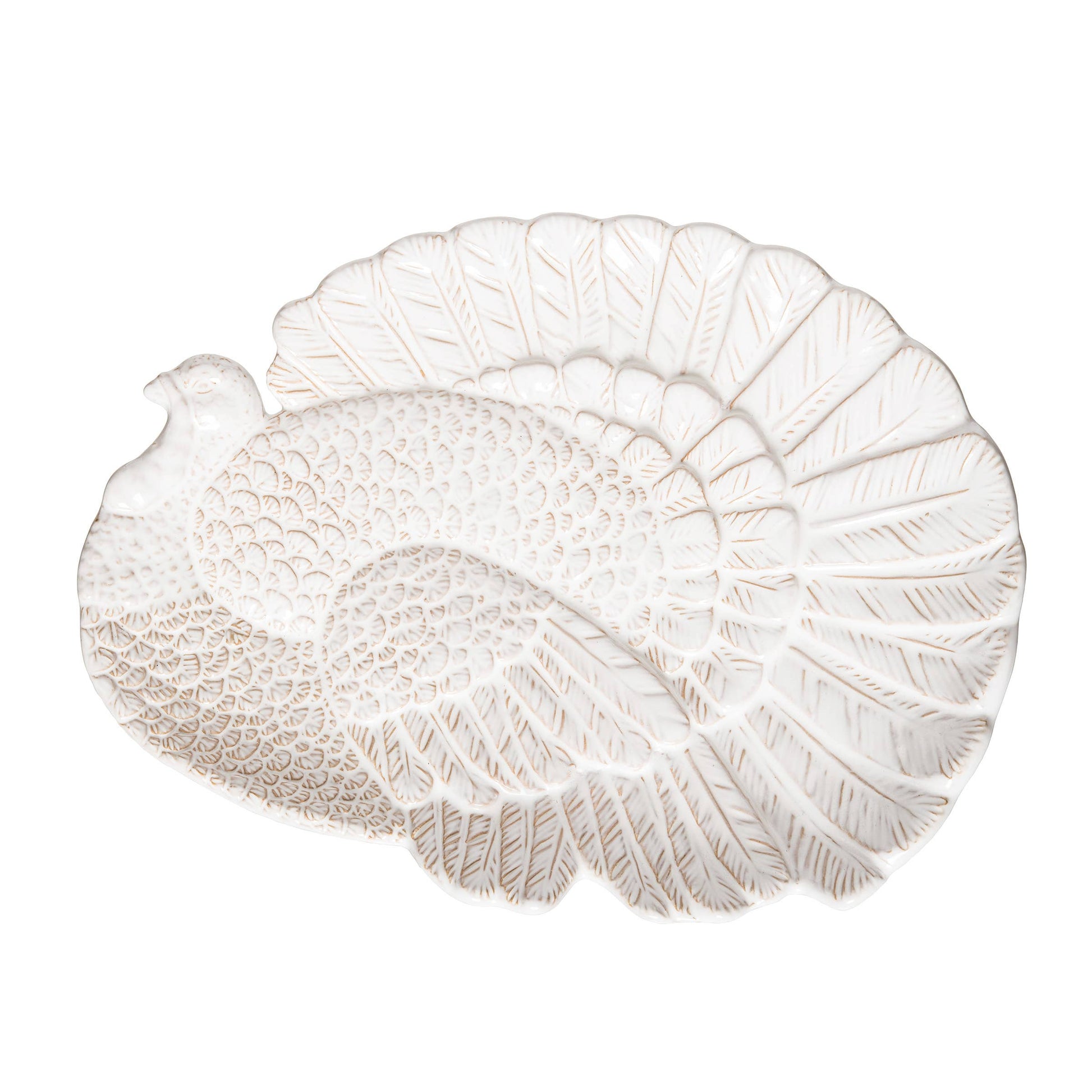 Serve up Thanksgiving delights on this White Turkey platter. Crafted with attention to detail, it features a beautifully embossed turkey design, adding a touch of elegance to any holiday table. Whether showcasing the main course or a selection of appetizers, this platter is a versatile and stylish addition to entertaining essentials. Food safe, stoneware.