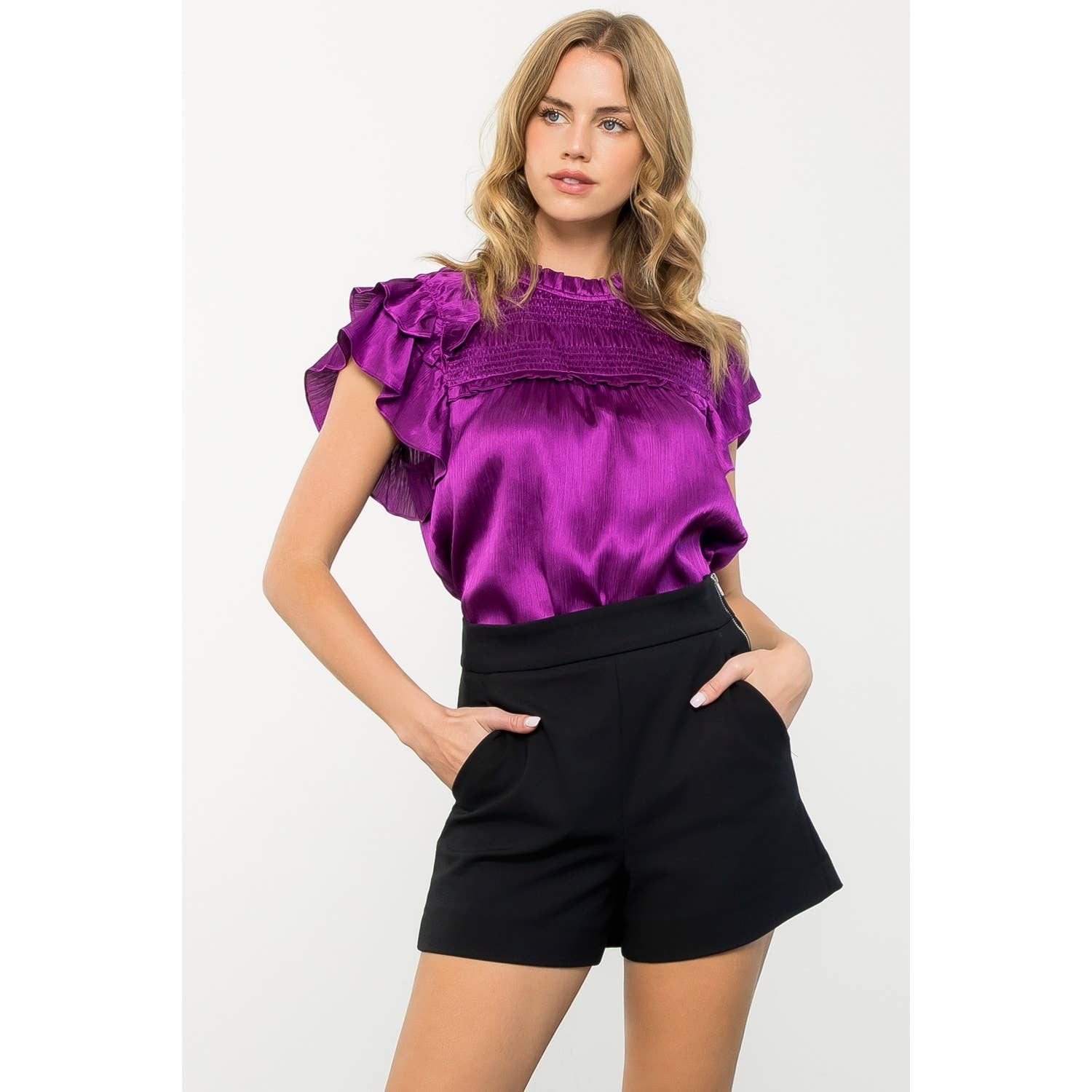 This purple flutter sleeve shimmer top combines contemporary design with timeless appeal. The gracefully tapered flutter sleeves create an elegant silhouette while the luminous shimmer fabric adds dimension and visual interest. Crafted for versatility, it works beautifully with evening wear or dressed down for sophisticated daytime styling. The rich purple hue complements a wide range of skin tones and pairs effortlessly with neutral or jewel-toned pieces. Whether you're attending a special event or elevating your everyday aesthetic, this top delivers refined polish and understated luxury. A wardrobe essential that transcends seasons and occasions.