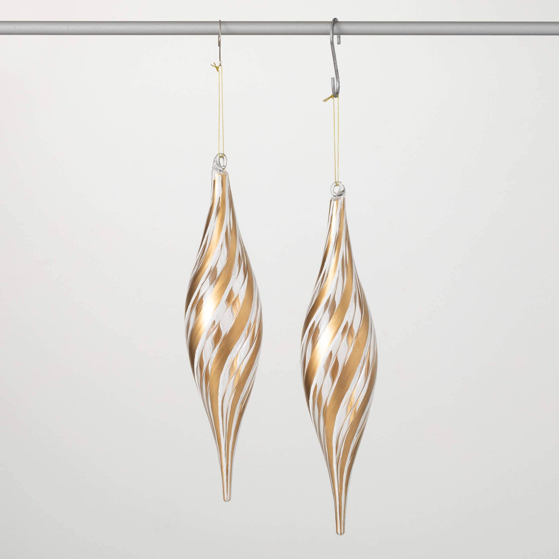These glamorous finials add just the right touch of holiday glitz to enliven any Christmas decor. Crafted from sparkling glass in a chic striped design of silver and gold hues, they infuse sophistication and elegance into any space. Perfect for dressing up stair railings, table centerpieces, or mantel displays, these finials offer a modern twist on traditional Christmas decorations. Their elongated shape and striped pattern make a stylish statement that reflects the current trends in refined yet playful holiday decor. -Dimensions: 2.75"L x2.75"W x11.75" -Weight: 3.25oz -Color: Gold Clear -Material: Glass