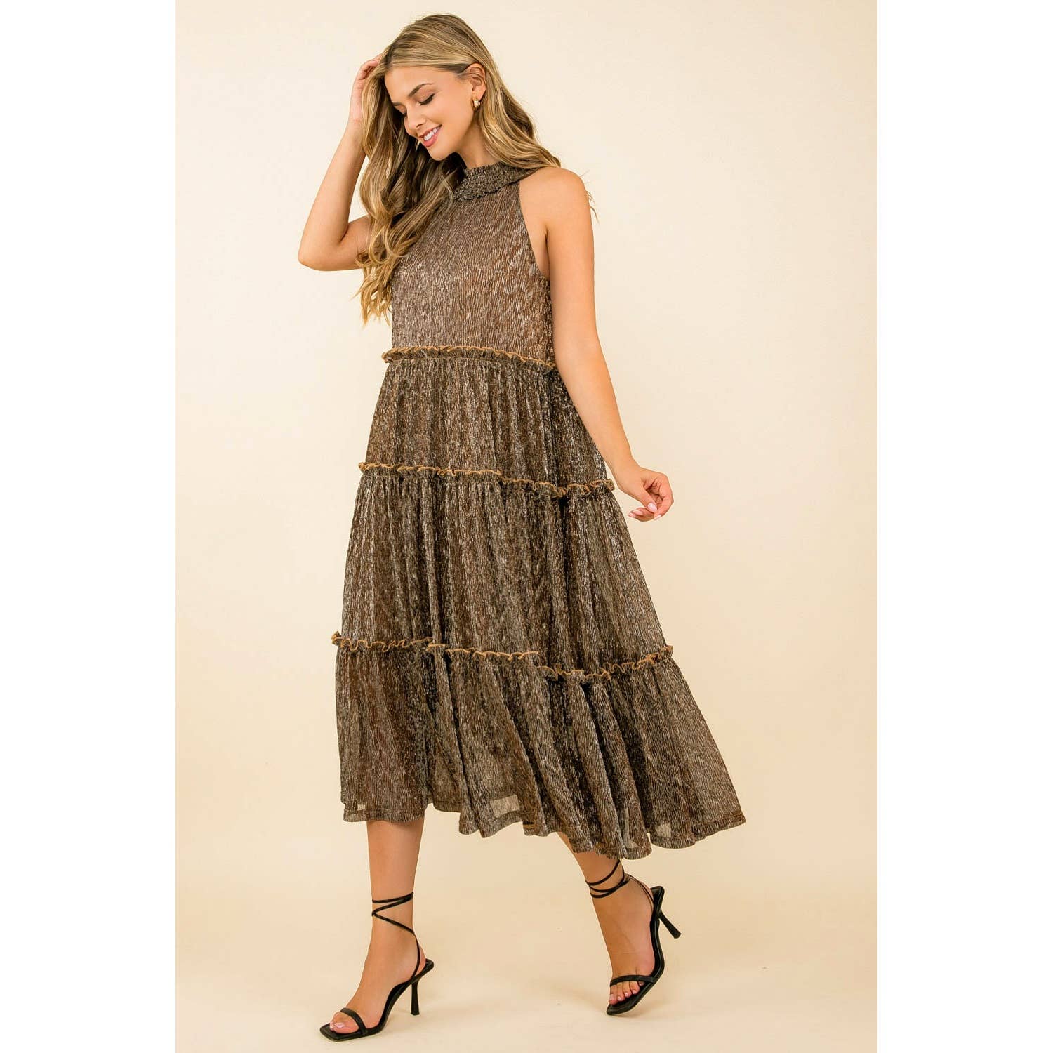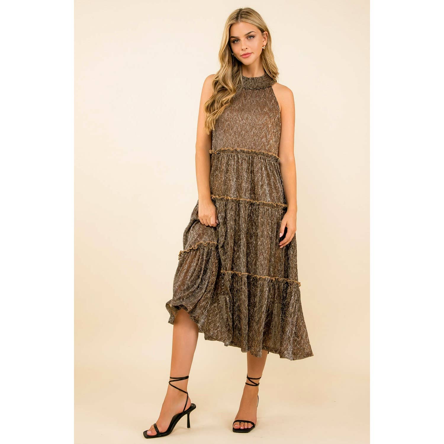The Haltered Haze Tier Dress combines contemporary elegance with eye-catching shimmer. This midi silhouette features a flattering halter neckline that provides secure support while showcasing the shoulders, paired with cascading tiered layers that create dynamic movement and visual interest. The metallic finish catches light beautifully, making it an ideal choice for evening events, celebrations, or when you want to make a sophisticated statement. The midi length offers versatility for various occasions while maintaining a polished, refined aesthetic.