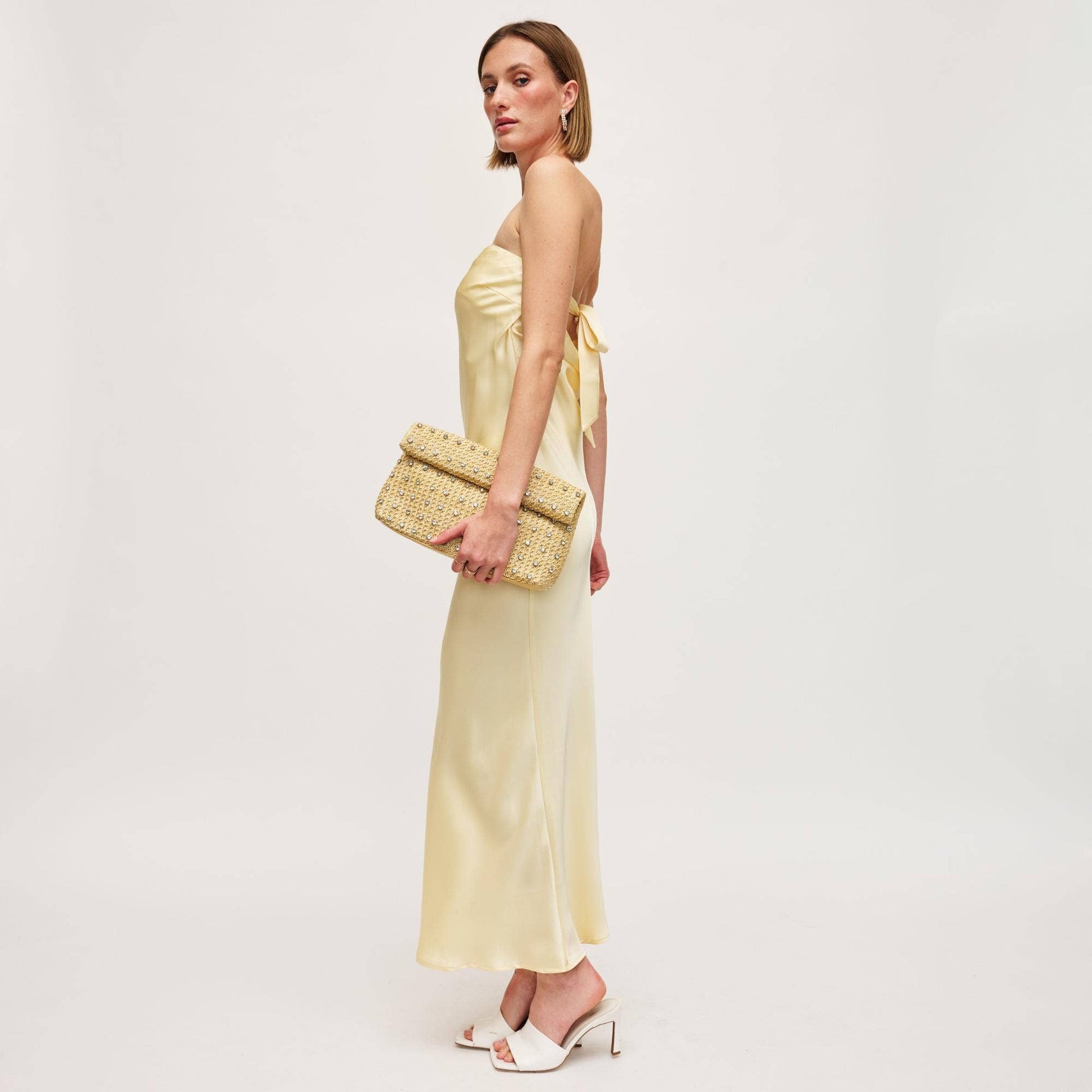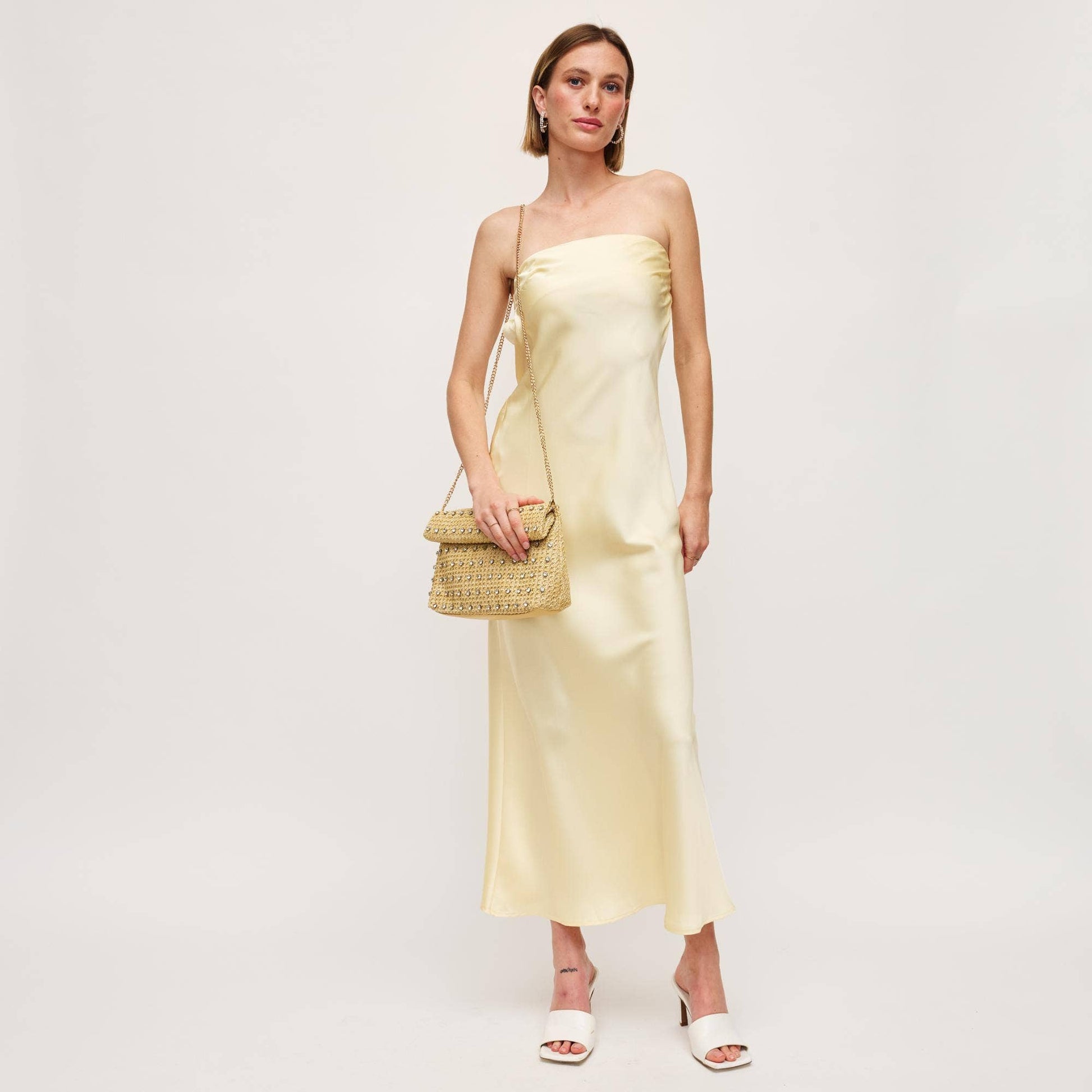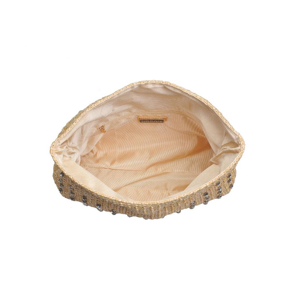 Fold over Flap, Woven Design, Gold Hardware, Detachable Chain Strap, Rhinestone Detail, Fabric Lined, 1 Zip Pocket