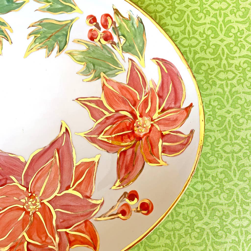 Celebrate this classic holiday image, the poinsettia flower. This ceramic oval platter features a poinsettia wreath around the piece. • Hand painted ceramic oval platter with 22k gold luster on the trim and accenting the poinsettia flowers and leaves. • Size: Size: 15" x 10.75" x 1.125" • Food safe • Hand wash only! All ceramic pieces are hand-painted, glazed and fired in our Louisiana studio. Due to this handmade nature each piece and vary slightly. OUR PRODUCTION PROCESS Magnolia Creative Co. pottery is made of a low-fire earthenware and then hand glazed and fired in our Louisiana studio. Pieces with gold edge and/or gold details are added with a real 22k gold luster in a second firing. Each firing can last between 4 - 8 hours and has to cool for up to 12 hours. Pieces trimmed in gold are food safe however, must be hand washed.