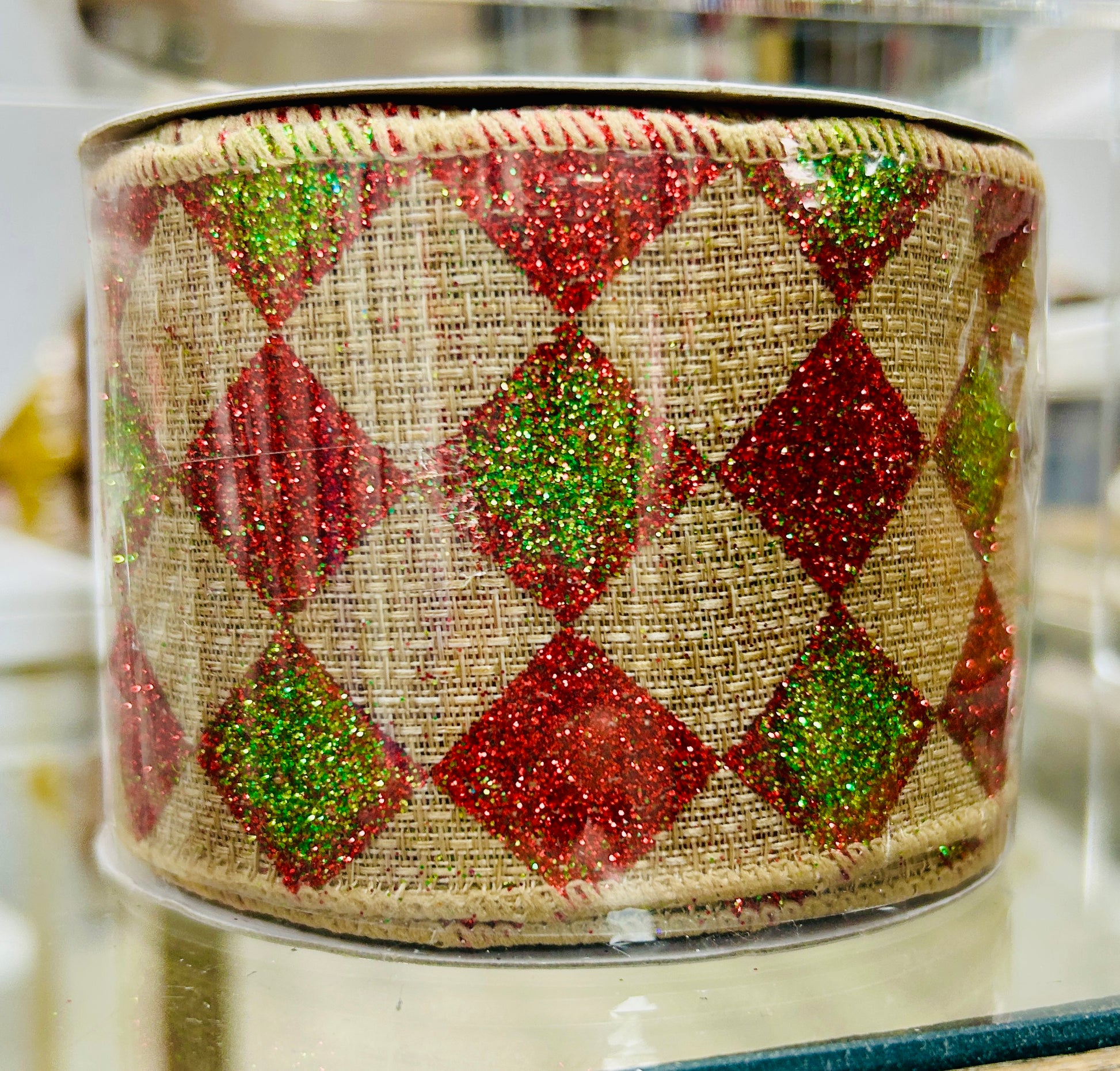 Red/Green Harlequin Sparkle Linen Wired Ribbon-2.5"