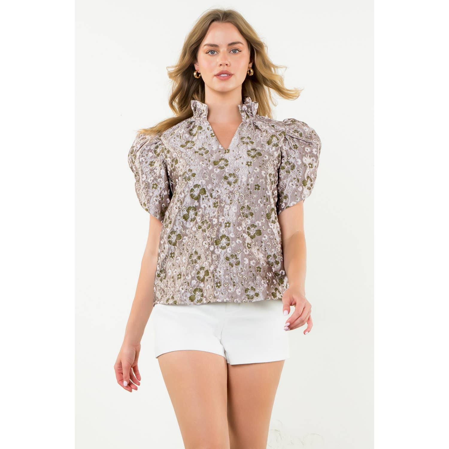 Elevate your everyday wardrobe with this sophisticated ruched sleeve textured top. The gathered sleeve detail adds dimensional interest while the textured fabric provides subtle visual depth and refined movement. Designed with a flattering silhouette, this versatile piece transitions seamlessly from casual outings to polished occasions. The taupe neutral tone pairs effortlessly with your existing pieces, making it an essential addition to any closet. Perfect for layering or wearing solo. This top delivers both style and comfort.