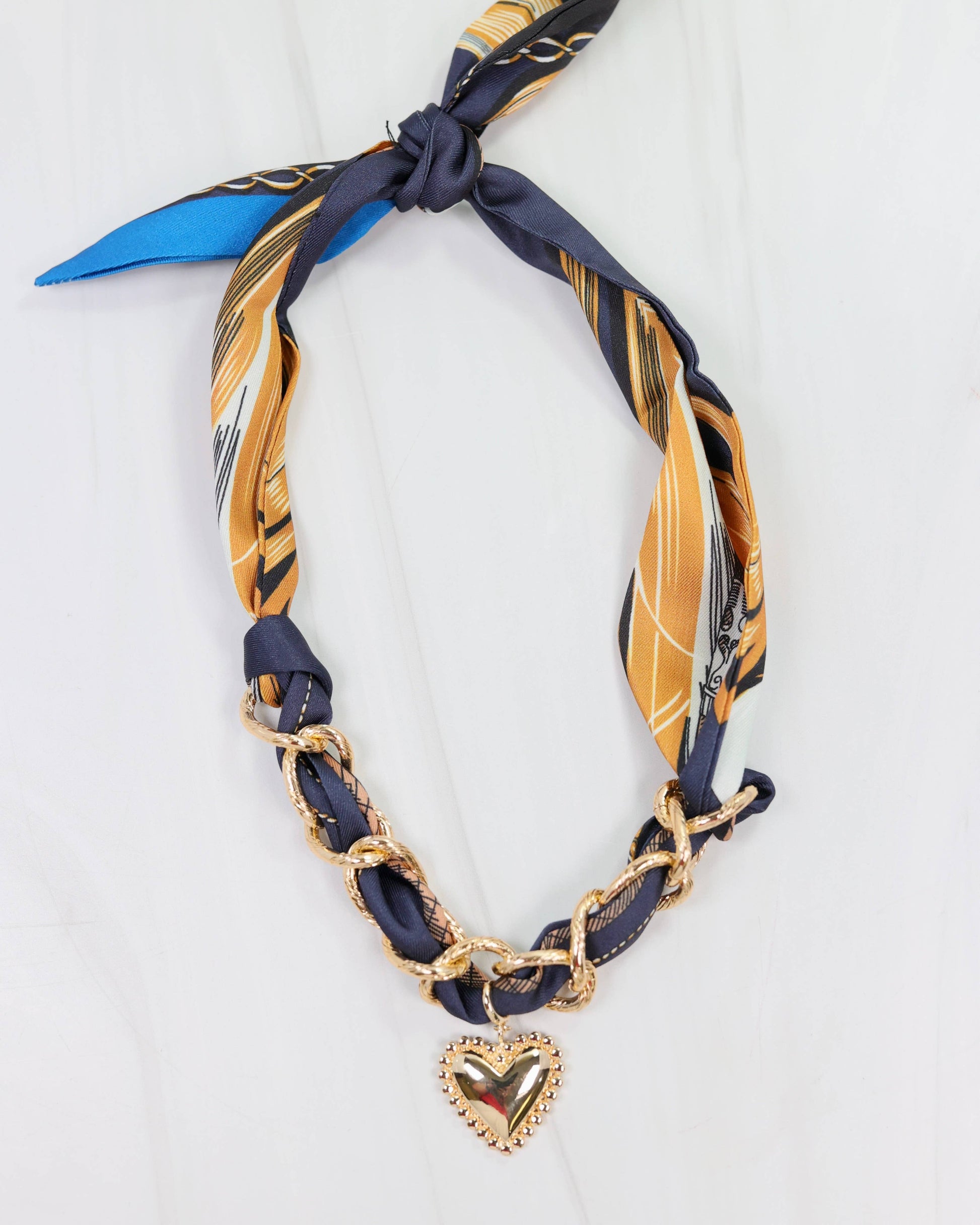 Add a fresh twist to your accessories with this playful scarf necklace. Featuring a delicate chain artfully twisted through soft navy fabric, it’s finished with an adorable heart charm that adds a touch of charm wherever you go. Perfect for elevating any outfit with a fun and flirty vibe.