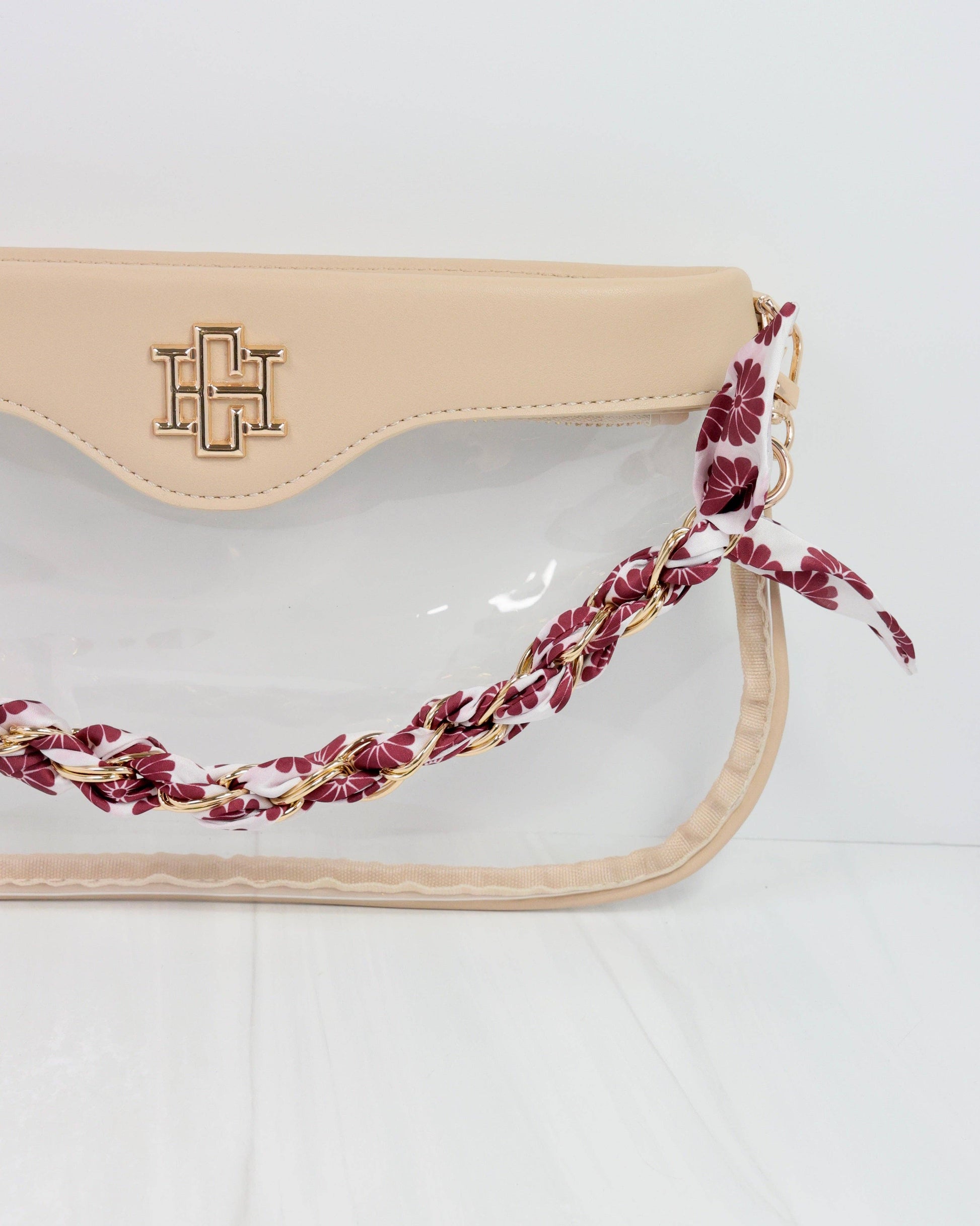 Elevate your accessory game with the Serafina Scarf Purse Chain in a retro Maroon Floral print. Featuring a chic gold link chain intertwined with a stylish printed scarf, this piece effortlessly combines school spirit with sophisticated fashion. Perfect for adding a refined yet spirited touch to your favorite handbag.