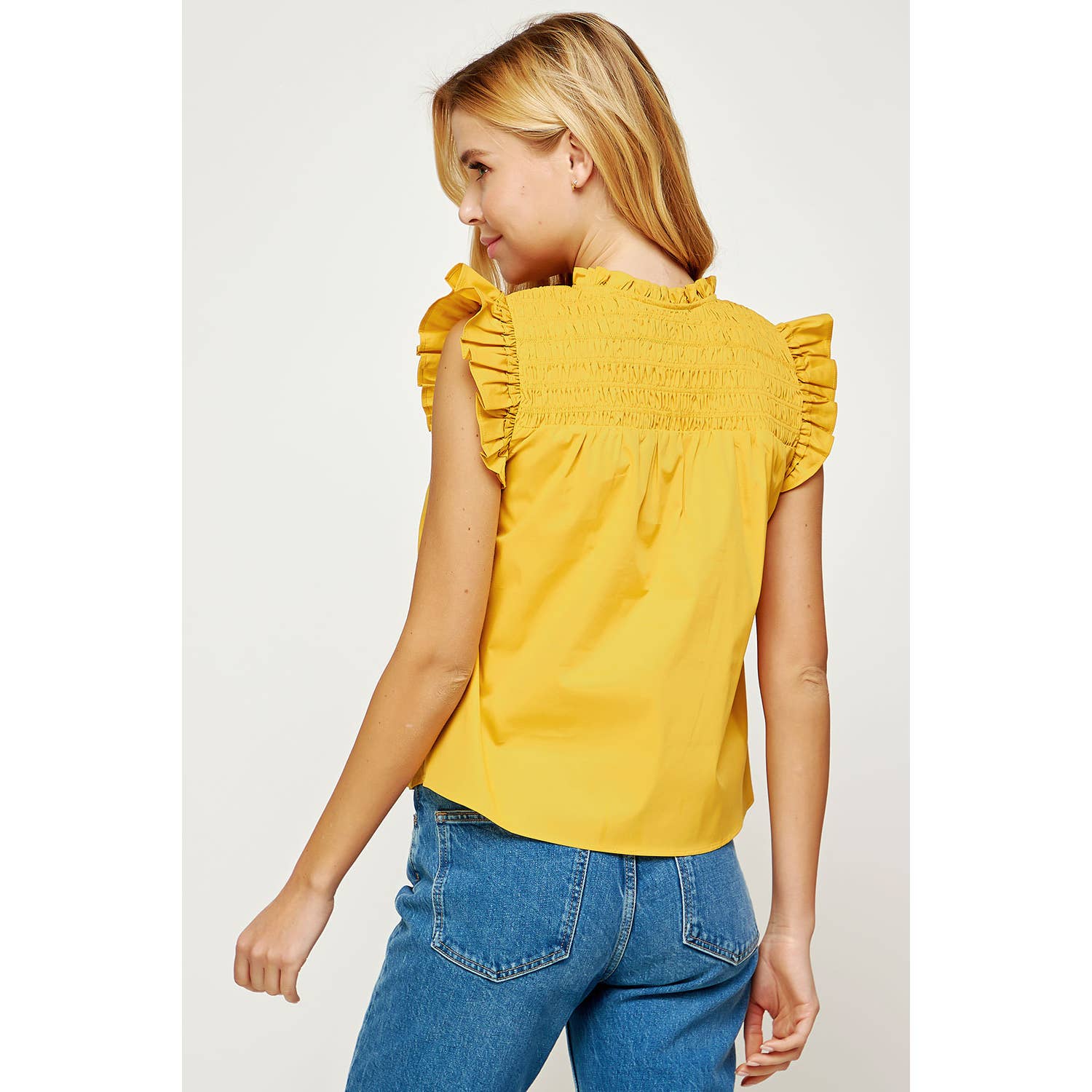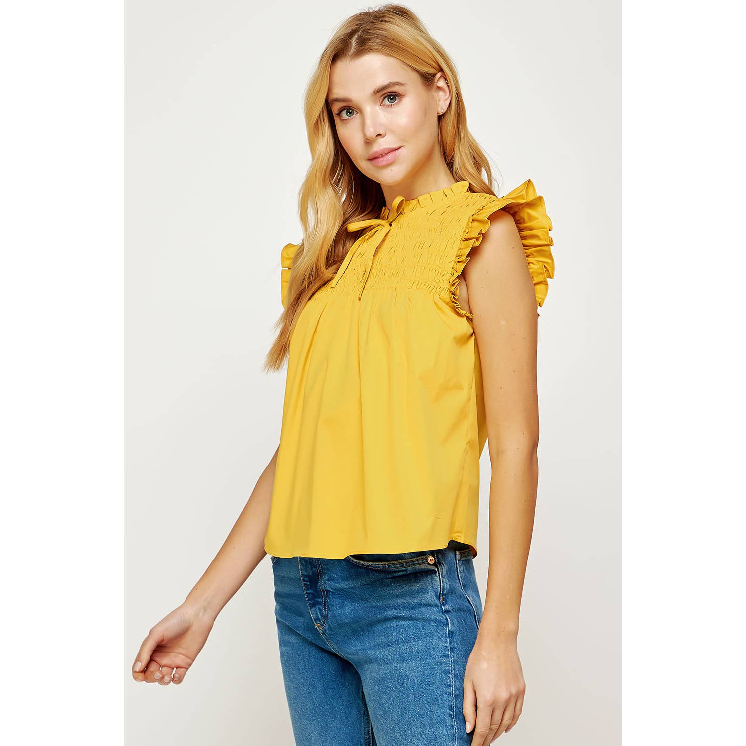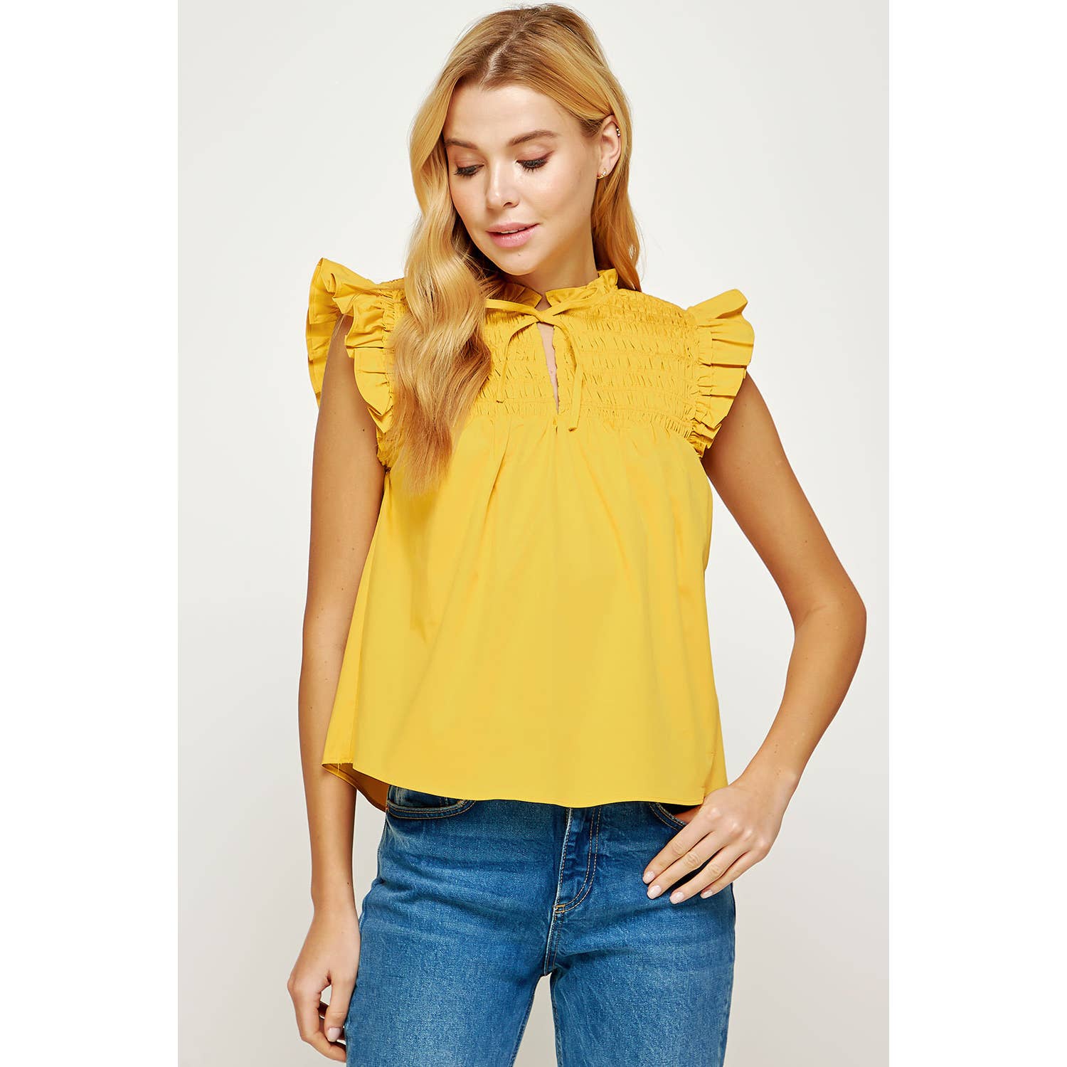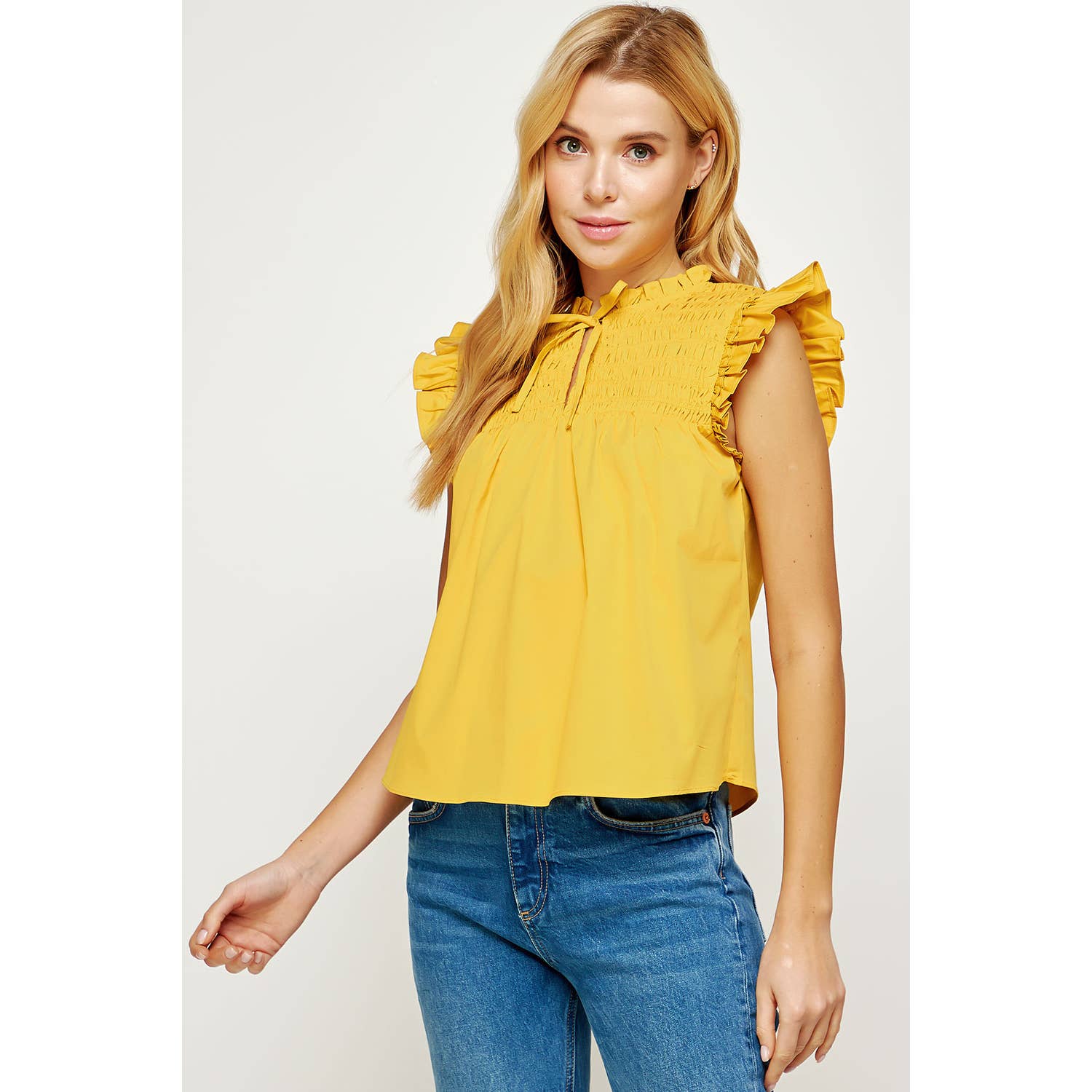 Smocked ruffled sleeveless blouse in poplin fabric. This style features double ruffles at shoulders, smocking at front/back yoke, keyhole with tie at front, and ruffles at neck.