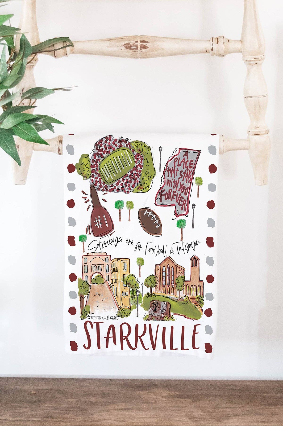 Linen Tea Towel showcasing all the places that make Starkville so special! Artwork by Rachel Walker of SWG. Measures 19" x 28".