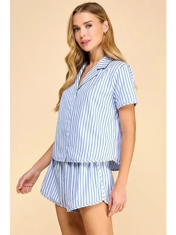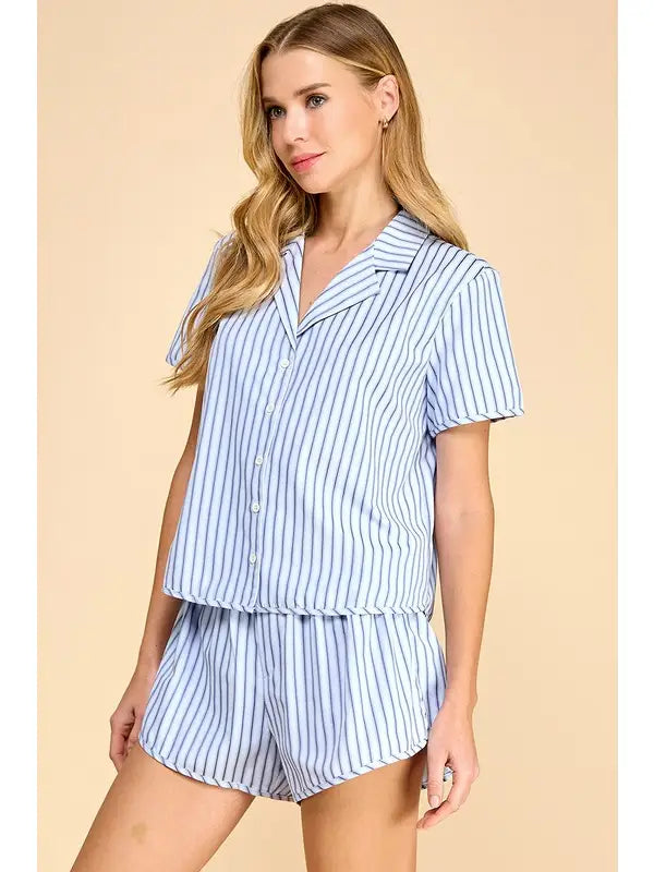 Motion striped short-sleeve button-up pajama set with matching bottoms.