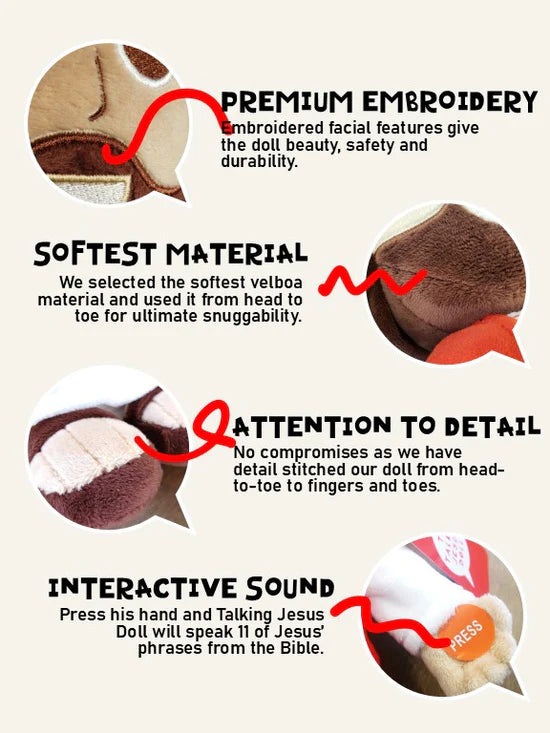 Give a gift with meaning with The Talking Jesus Doll - the adorable plush Jesus speaks 10 phrases that Jesus said in the Bible. Kids love to press Jesus' hand to make him talk. Grand/parents ❤️ their little ones are learning Jesus' words - even before they can read!