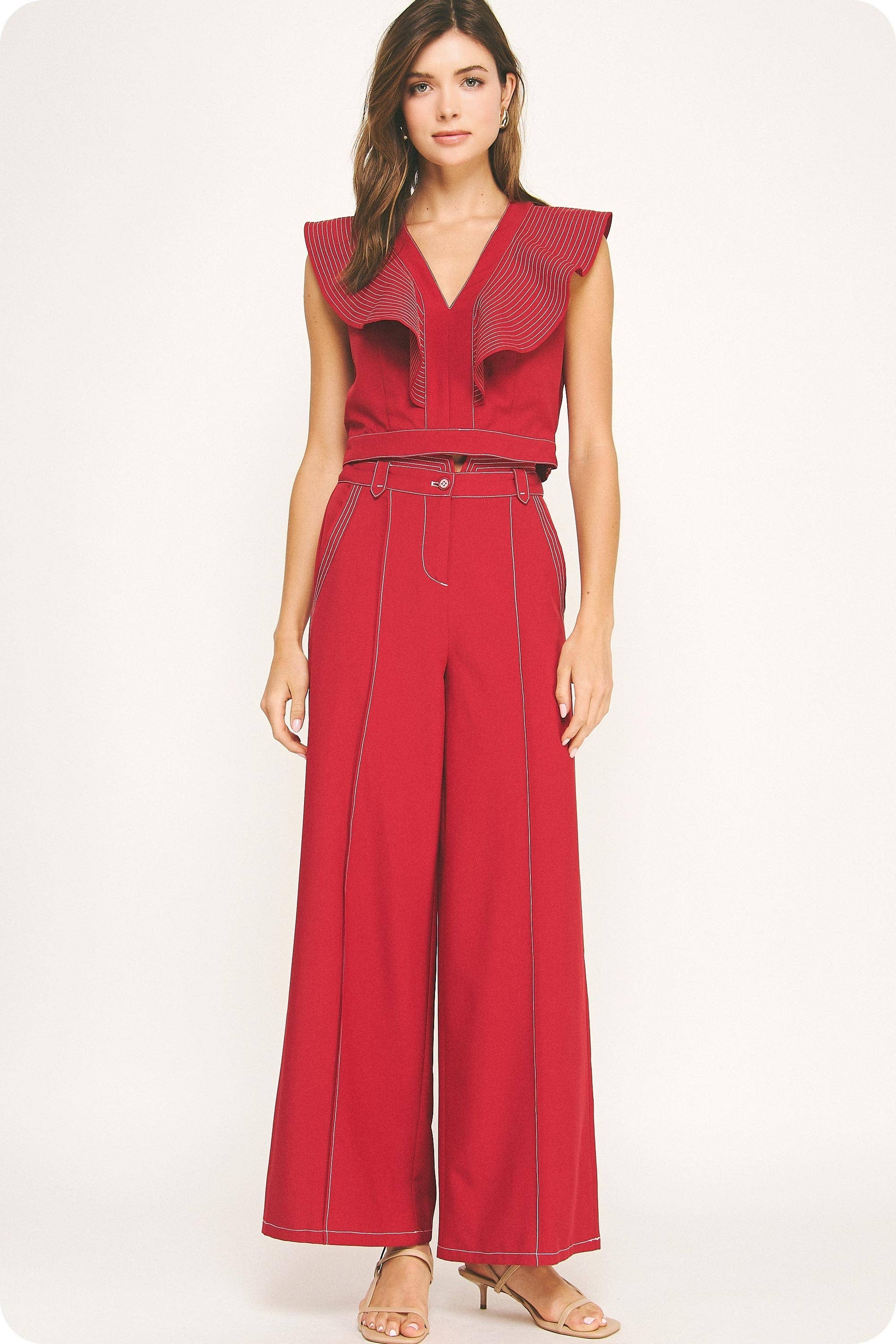 Top-stitch ruffle detail V-neck top in stretch suiting fabric. This sleeveless top features a classic V neckline, cascading ruffle with contrast top stitch detail, tie closure at back, and side zipper closure. It can be made into a set with pants